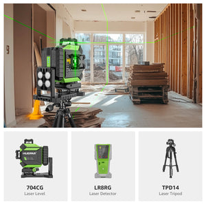 With a micro-adjust knob, the integrated 360° strong magnetic bracket allows for quick positioning to metal surfaces for wall applications. This magnetic bracket offers 1/4"-20 and 5/8"-11 mounting threads to suit different tripod threads. The Huepar 704CG floor laser tool generates a 360° horizontal tiling laser on the floor or wall, providing all-around leveling coverage for the layout of tile, stone, brick, carpet, and hardwood flooring. With the lifting base, the laser lines can rise from the surface to go over and travel past uneven surfaces or obstructions between 0.95" and 3.23" in height.