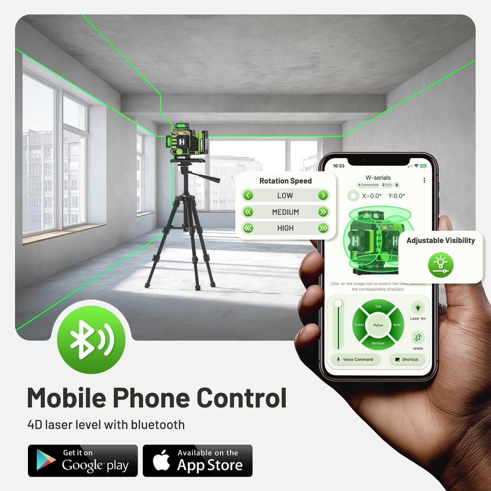 The comprehensive coverage of 16 laser lines creates a complete The W04CG laser level features an electric base with 3-speed adjustment, providing flexibility for a variety of precise leveling needs. With Bluetooth, remote control, and app-based remote operation, even single-person tasks are made simple—no need to constantly move back and forth to adjust laser lines, saving both time and effort.grid, ensuring pinpoint accuracy every time. With H/V independent switching, you can flexibly activate lines according to your specific needs, enhancing work efficiency while saving energy.